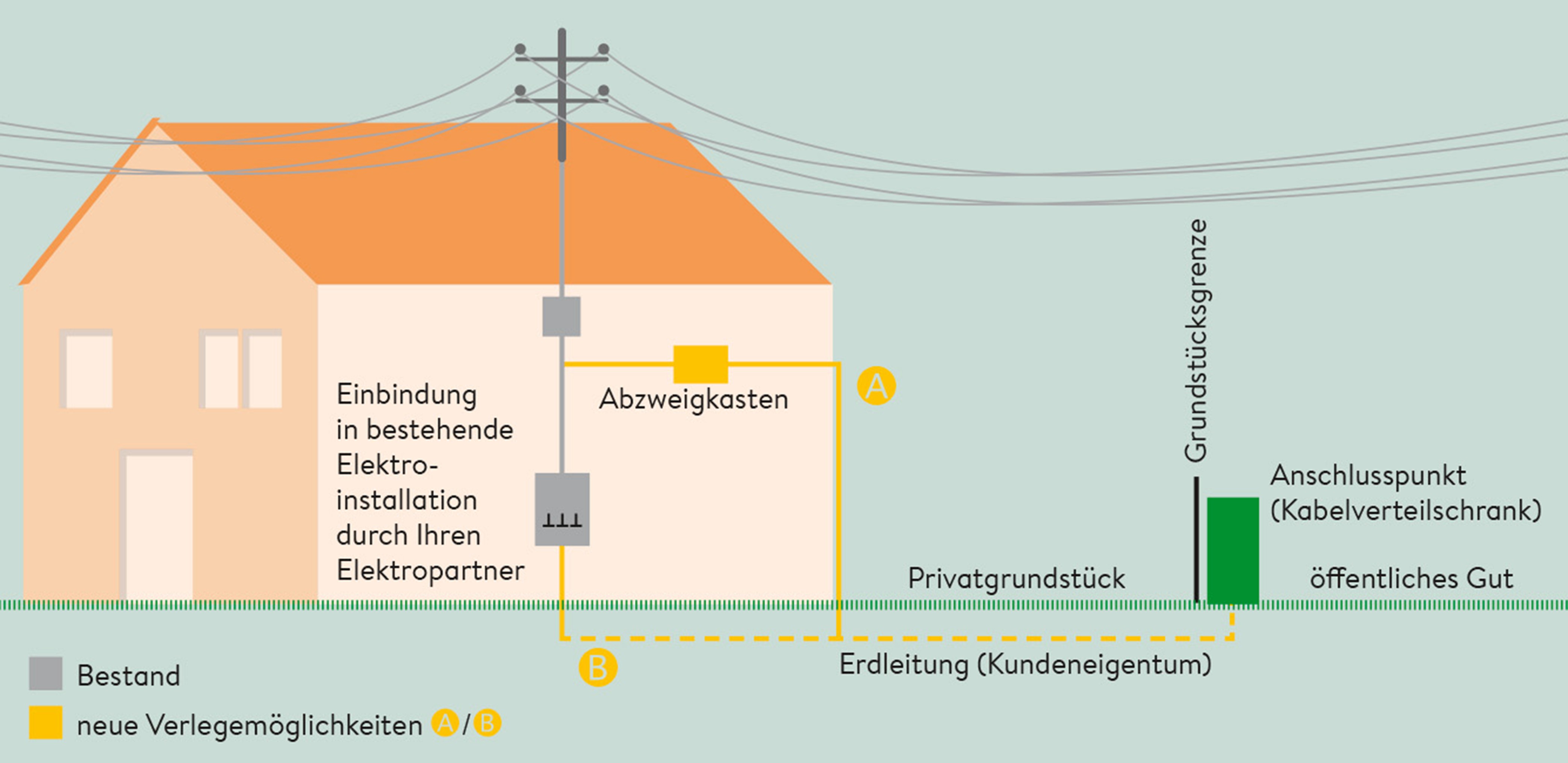 - Ein von Ihnen beauftragter Elektropartner verlegt die neue Erdleitung vom Kabelverteilschrank bis ins Haus zu einem geeigneten Anschlusspunkt.