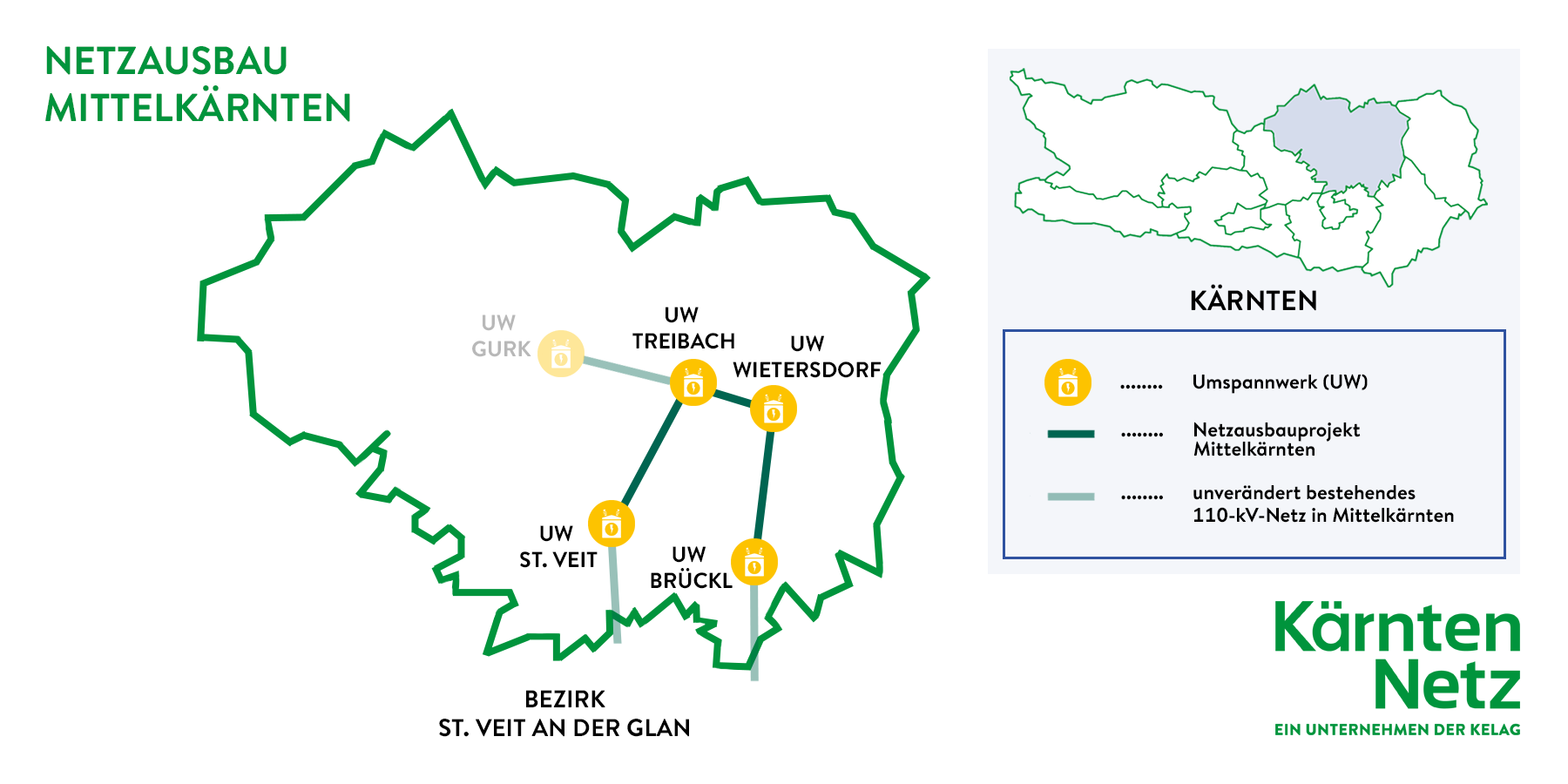 Ein leistungsfähiges 110-kV-Netz ist eine wichtige Voraussetzung für die Weiterentwicklung des Wirtschaftsstandortes Mittelkärnten, für die Integration von zusätzlicher Stromerzeugung aus erneuerbarer Energie in das Gesamtsystem und für das Gelingen der Energiewende. Die bestehende 110-kV-Leitungsverbindung von St. Veit an der Glan über das Krappfeld nach Althofen und weiter nach Wietersdorf und Brückl im Görtschitztal muss erneuert werden. Für dieses Projekt hat die Kärnten Netz mit den Planungsarbeiten begonnen. Bereits in Bau ist das neue Umspannwerk der Kärnten Netz in Treibach.