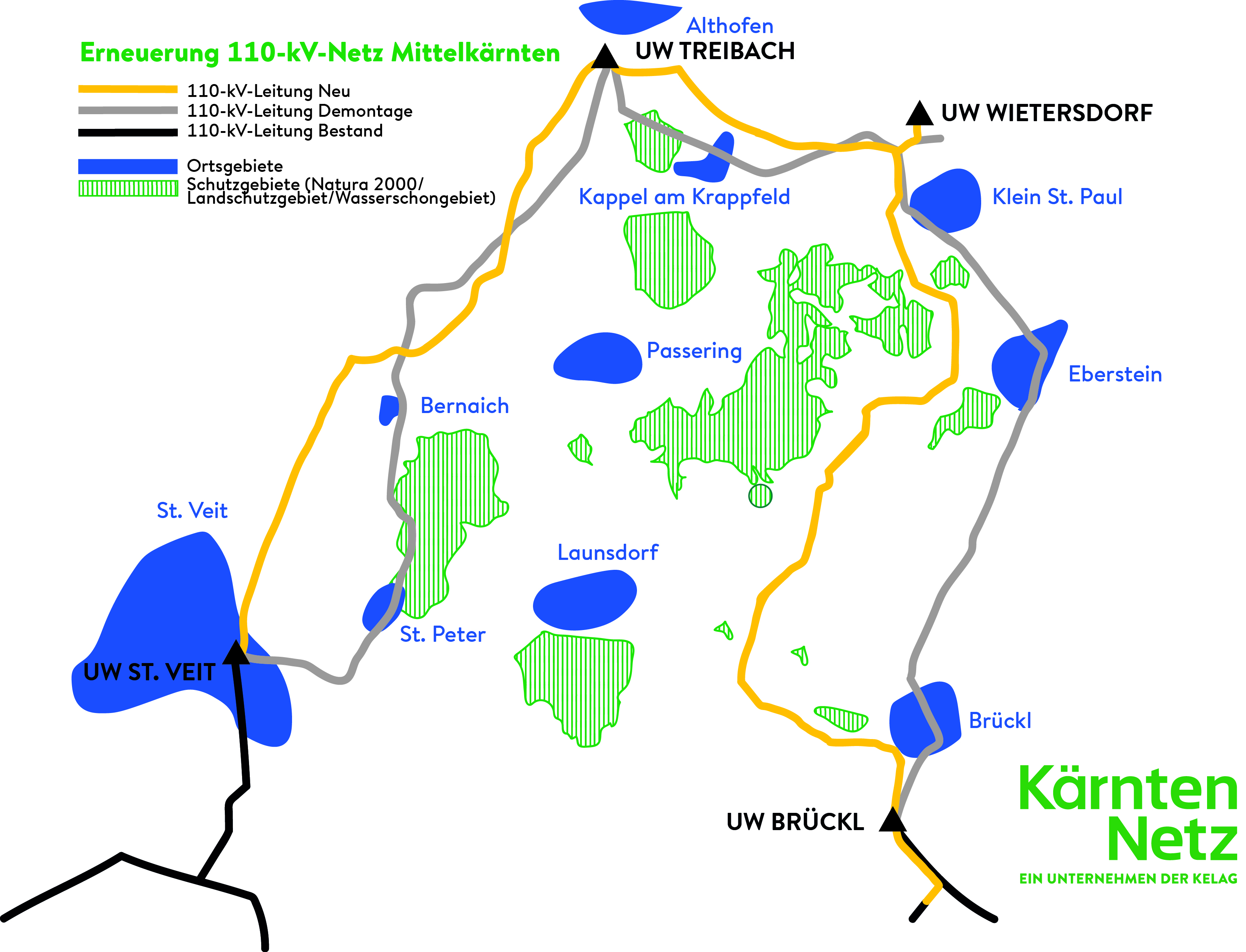 Die neue, rund 38 km lange 110-kV-Freileitung führt von St. Veit an der Glan über Treibach-Althofen und Wietersdorf bis nach Brückl und ersetzt die bestehende, rund 70 Jahre alte 110-kV-Leitung. Die Kärnten Netz wird rund 90 Millionen Euro in dieses Leitungsprojekt investieren, das die Stromversorgung in der Region in den nächsten Jahrzehnten sichern wird — als eine wichtige Voraussetzung für die Weiterentwicklung des Wirtschafts- und Lebensraumes Mittelkärnten.
